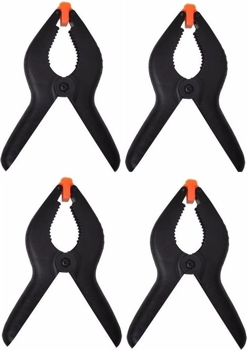 Een set met 4 zwarte hobbyklemmen/marktkraamklemmen/lijmklemmen. Afmeting: ca. 4 x 10 cm. Materiaal: kunststof.